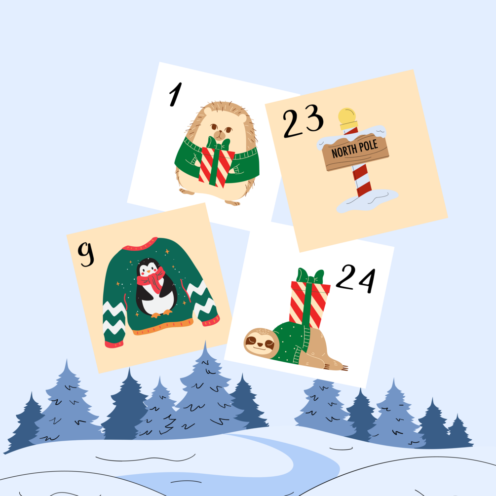 Advent Calendar for kids with cute woodland animals, cozy drinks, Christmas tree, Santa, winter rainbows, ornaments and floral elements and so much more!